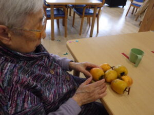昨日、干柿用の柿を収穫して頂きましたので、視覚障害者の方に手で触れて頂きました。嬉しそうに早く食べたいと言ってみえました。お猿さんにとられないようにしたいですね。