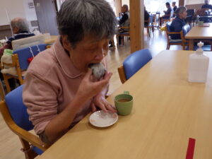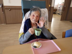 今日の優・悠・邑 和 2025.11.20 寒い朝でした。 本日はかなり冷え込みました。なごみの畑も霜がおりていました。 それでもなごみの入所者様は毎日お元気です。 畑の様子が気になり見に行きました。白菜がみずみずしく育っていました。 こちらは15時のおやつの様子です。先日ローソン移動販売で購入された豆大福を召し上がられています。 こちらの入所者様のおやつはローソンのクリームパンと黒豆甘納豆です。もちろんペロリと召し上がれてました。もうすぐ105歳を迎えられますが職員よりも新作スイーツを召し上がれています。