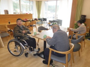 「出身はどちらですか?」普段接点がない方とのお話は緊張しますね。そんな時は職員さんが間に入り会話を盛り上げてくれます。