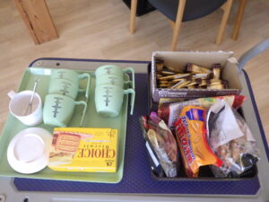 午後からは茶話会です。ローソンの移動販売で購入されたおやつを持ち寄りコーヒーを楽しまれていました。