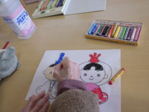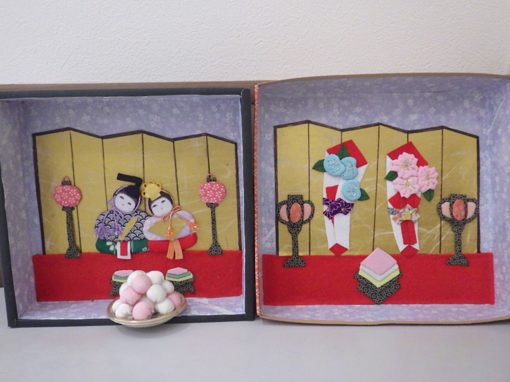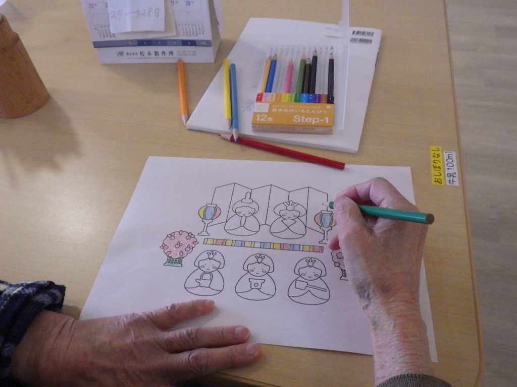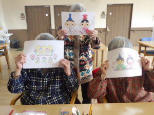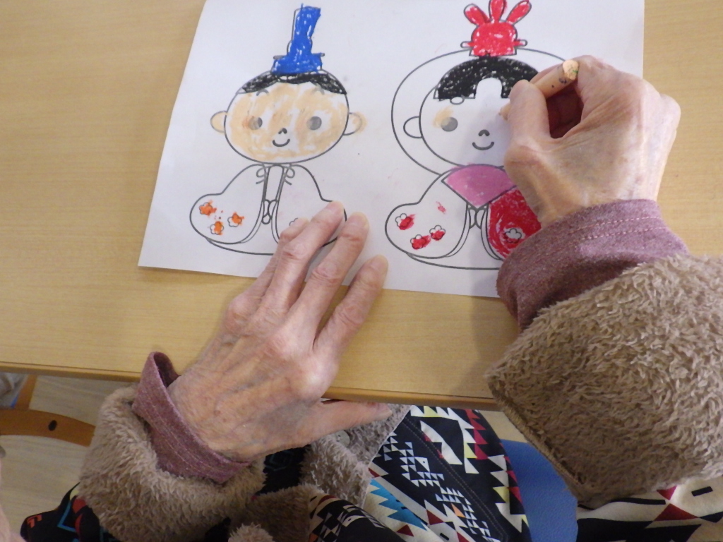 今日の優・悠・邑 和 2026.2.11 手芸クラブが出来ました 朝から雨が降って少し薄暗かったですが、なごみの利用者様にお雛様に向けて塗り絵をして頂きました。可愛いお内裏様とお雛様が出来ました。 素敵なお雛様の完成です。 こちらは箱雛のお雛様です。 3月のお雛祭りが待ちどうしいですね。 和の手芸クラブの職員手作りのバルーンバックが出来上がりました。 サイズもピッタリに出来上がりました。 移動の時も新しいバックで気持ちがいいですね。 これからも色々なクラブで皆さんの為に頑張っていきたいと思います。