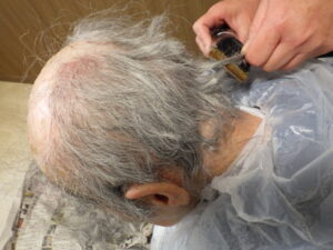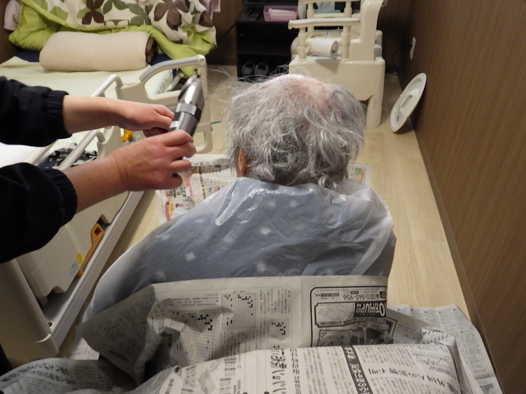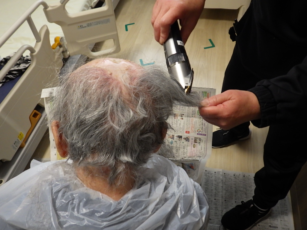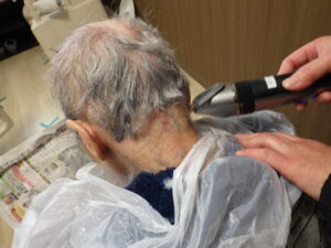 利用者様の髪の毛が伸びてきた為、職員がカットしました。