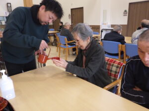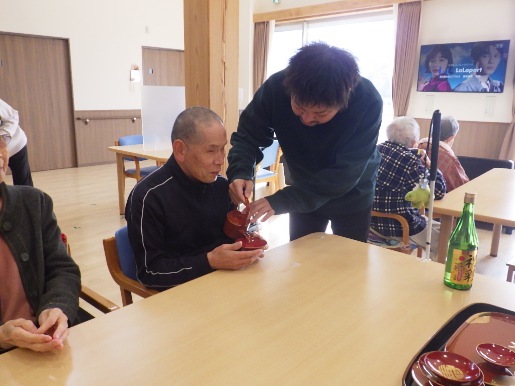 今日の優・悠・邑 和 2026.1.1 新しい年を迎えました 新しい年を元気に迎えられられたことを職員一同嬉しく思ってます。 午前には、施設長よりお屠蘇を振舞って頂きました。 これは職員のお母様が作られたものだそうです。ステキですね♬どこに飾りましょうか? 午後からは 正月の遊びの一つ「すごろく」をしました。 職員の手作りの「健康すごろく」 ゴール目指して 皆さん頭をひねったり、体を動かしたり 笑ったりで、楽しく健康になれたかな? 今年も楽しく笑って過ごしましょうね 本年のよろしくお願いします。