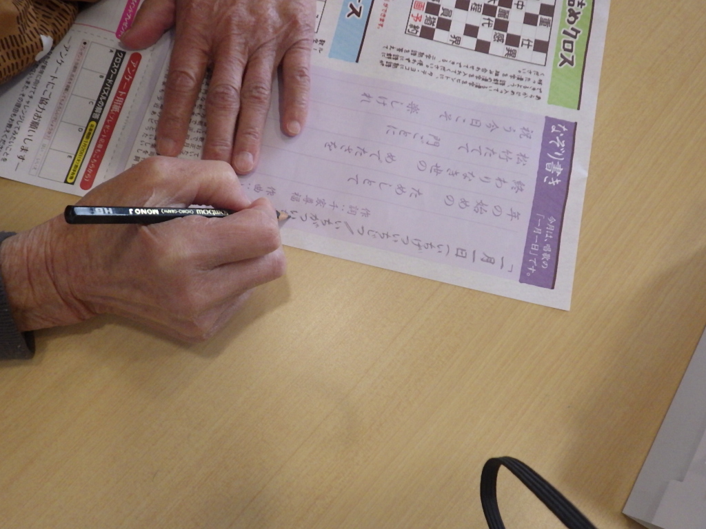 今日の優・悠・邑 和 2026.1.4 新年初カラオケ 今日も寒い1日でしたね お正月の三が日も過ぎ、そろそろ日常生活に戻っていく頃です 毎週恒例のカラオケ 皆さん楽しみにしてみえます 皆さん元気いっぱいに歌うことができました! こちらは脳トレです。間違い探しや、字を書く練習に取り組んでおられました 今年もいろいろな事にたくさんチャレンジできるといいですね(^▽^)/