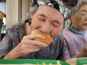 「ん~~いい匂い!いただきます!」とチーズバーガーにかぶりつかれていました。