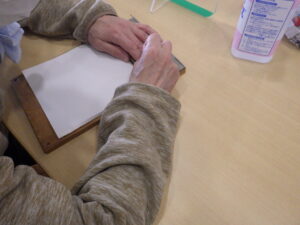 さて、午後からはゆったりとした時間が流れます。こちらの入所者様は友人の方が読まれた俳句を点字で打って下さっています。