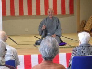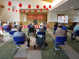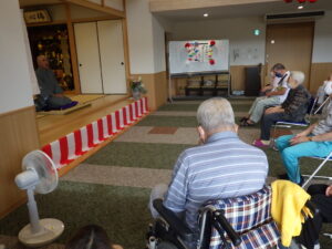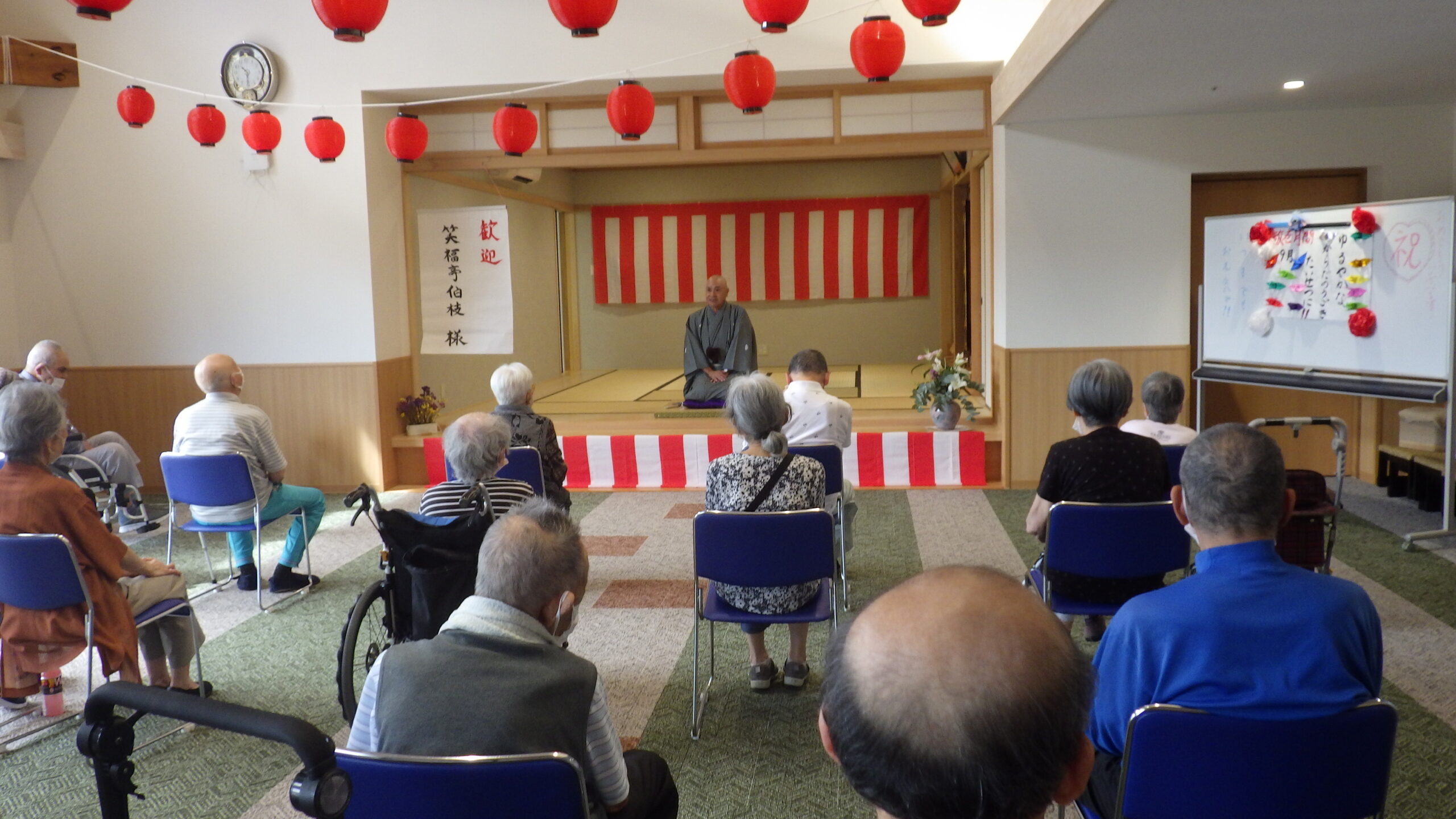 今日の優・悠・邑 和 2025.9.21 笑福亭伯枝師匠様をお招きしました。 敬老月間の一つ、笑福亭伯枝師匠様の落語を聞かせて頂きました。真剣に聞きながら、笑いありの時間を過ごされました。はじめて聞かれた入居者様はとても良かったとの感想でした。またの機会を楽しみにしてみえました。 敬老月間も後わずかになりましたが、まだまだ楽しい事がありますよ…。