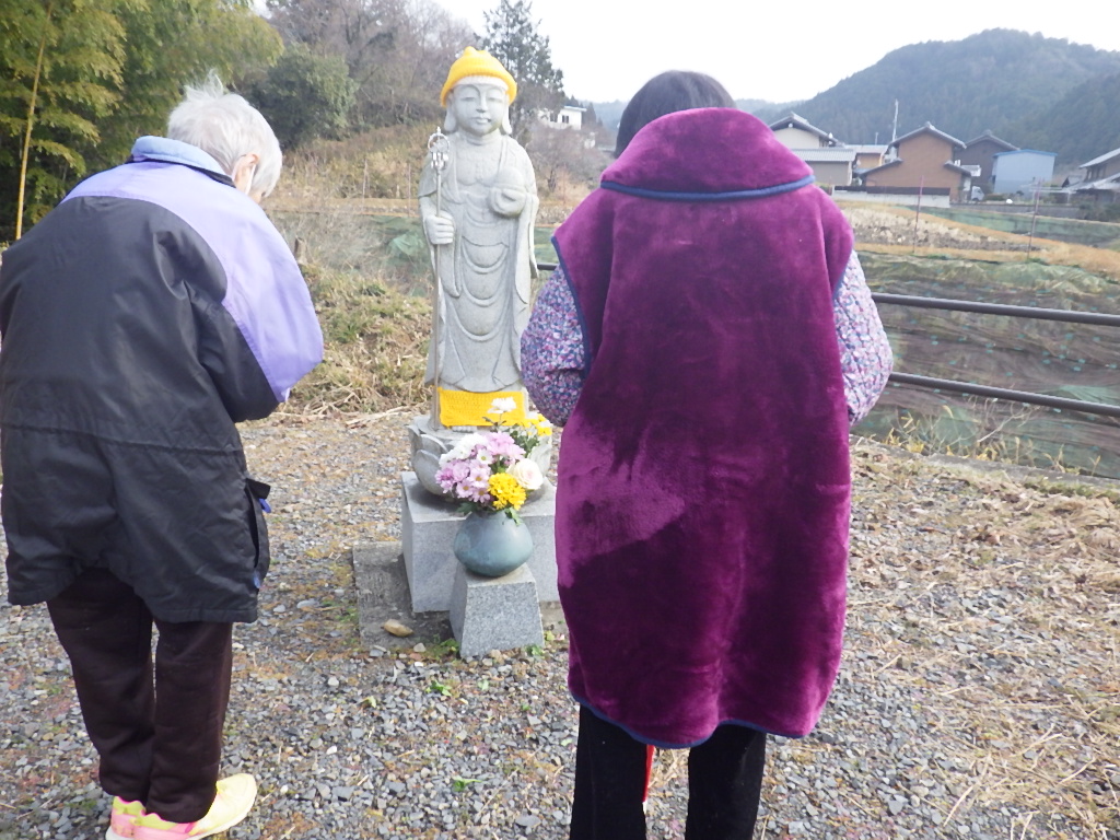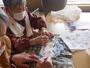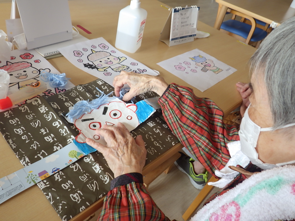 今日の優・悠・邑 和 2026.1.15 節分まじか 入居者様に節分のお面を作成して頂きました。怖くないねと呟いてみえました、。又、鬼とおたふくの色塗りもして頂きました。2月3日は何処から鬼が登場するか楽しみにですね。 新しいお花をお地蔵様にお供えしました。お地蔵様良いお顔でお迎えして頂きました。色々なお願いされていました。 今日も楽しい日でしたね。