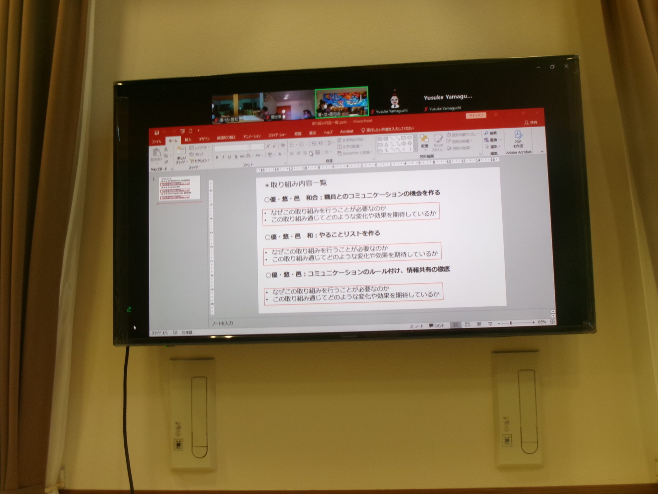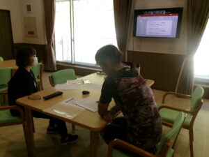 今日の優・悠・邑 和 2025.9.16 認知症介護研修に参加しました。 本日の午後から認知症介護研究・研修センター山口友佑講師による研修が行われました。 ZOOMで講師と同法人3施設を繋ぎそれぞれの施設の職員が参加しました。 それぞれの施設の困りごとを「職場の困りごと解決シート」を活用し、個人ワーク、グループワークを行いながら解決に向けて取り組みます。 困りごとに対し「なぜこの取り組みが必要なのか・この取り組みを通じてどのような変化や効果を期待しているか」を考えながら取り組んでいきます。