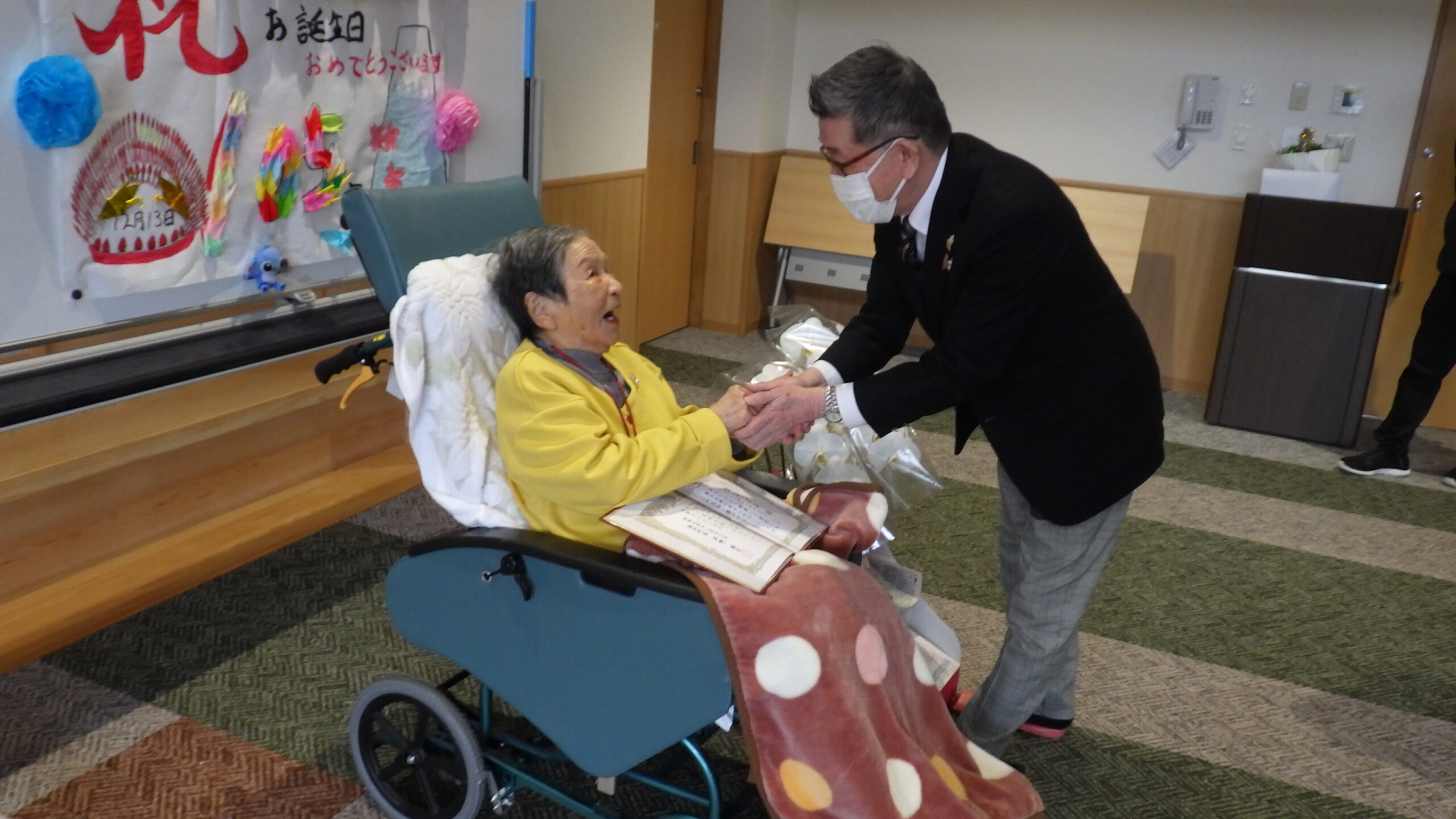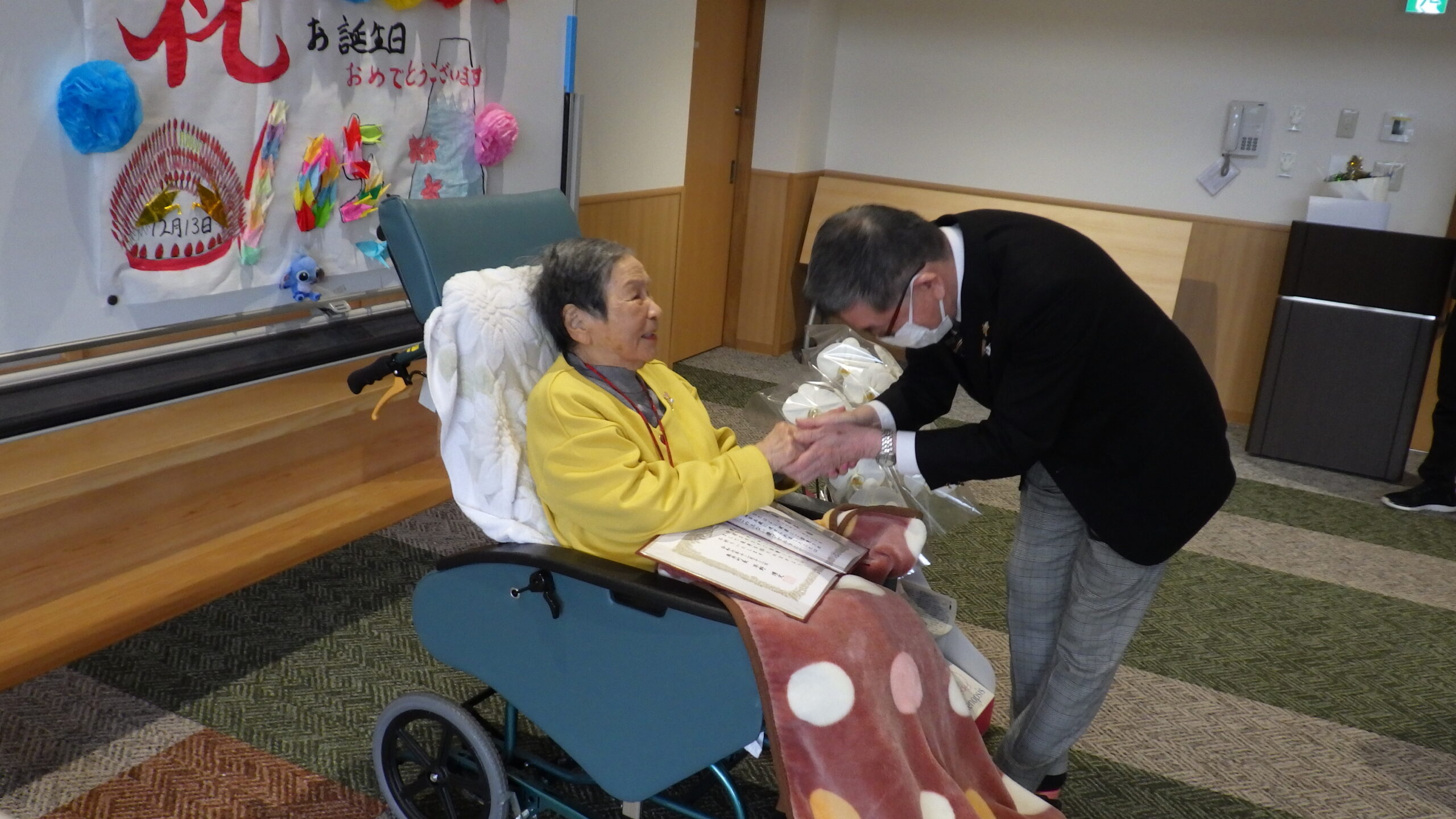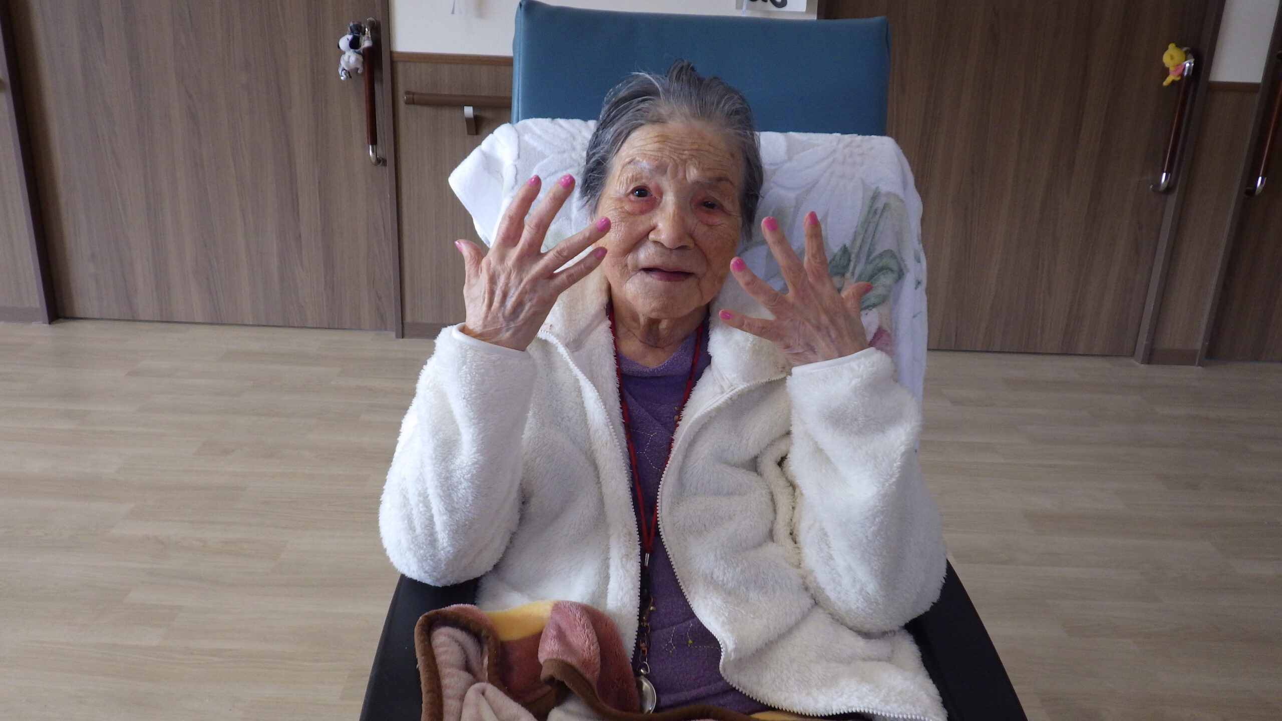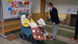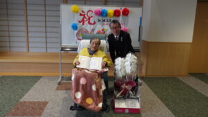 今日の優・悠・邑 和 2025.12.15 長寿のお祝い 今日は入所者様が105歳になられ 町長様からお祝いを受けられました。 町長様がお見えになられる前に まずお化粧をしてもらい 爪にピンクのネールをしてお気に入りのお洋服に着替え準備しました。本人も満足そうでした。下準備が出来待って見えました。 町長様からお祝いの言葉を頂き、記念写真を撮って頂き嬉しそうでした。 105歳 おめでとうございました。これからも元気で長生きして下さいね。//。