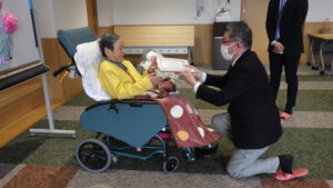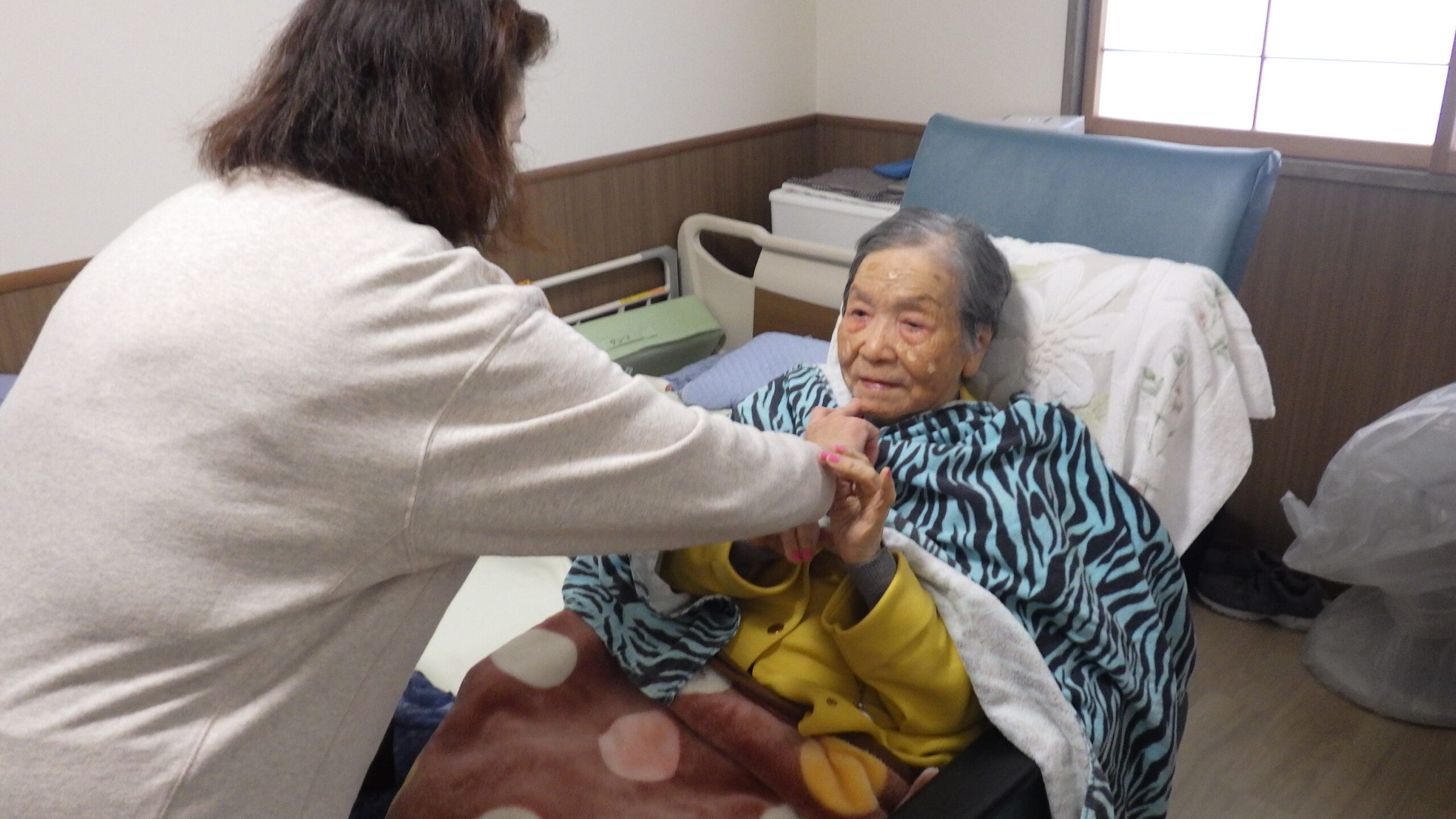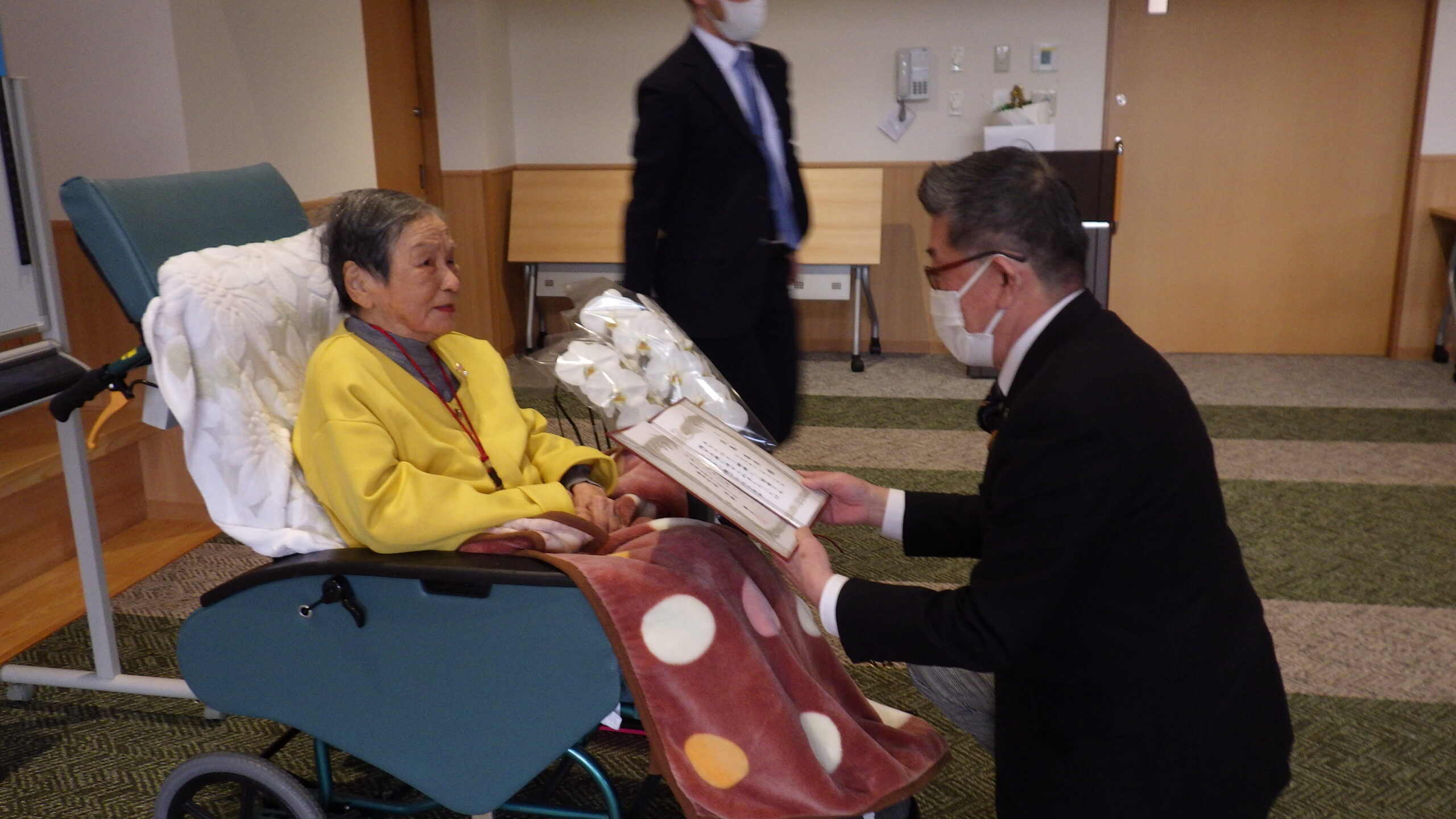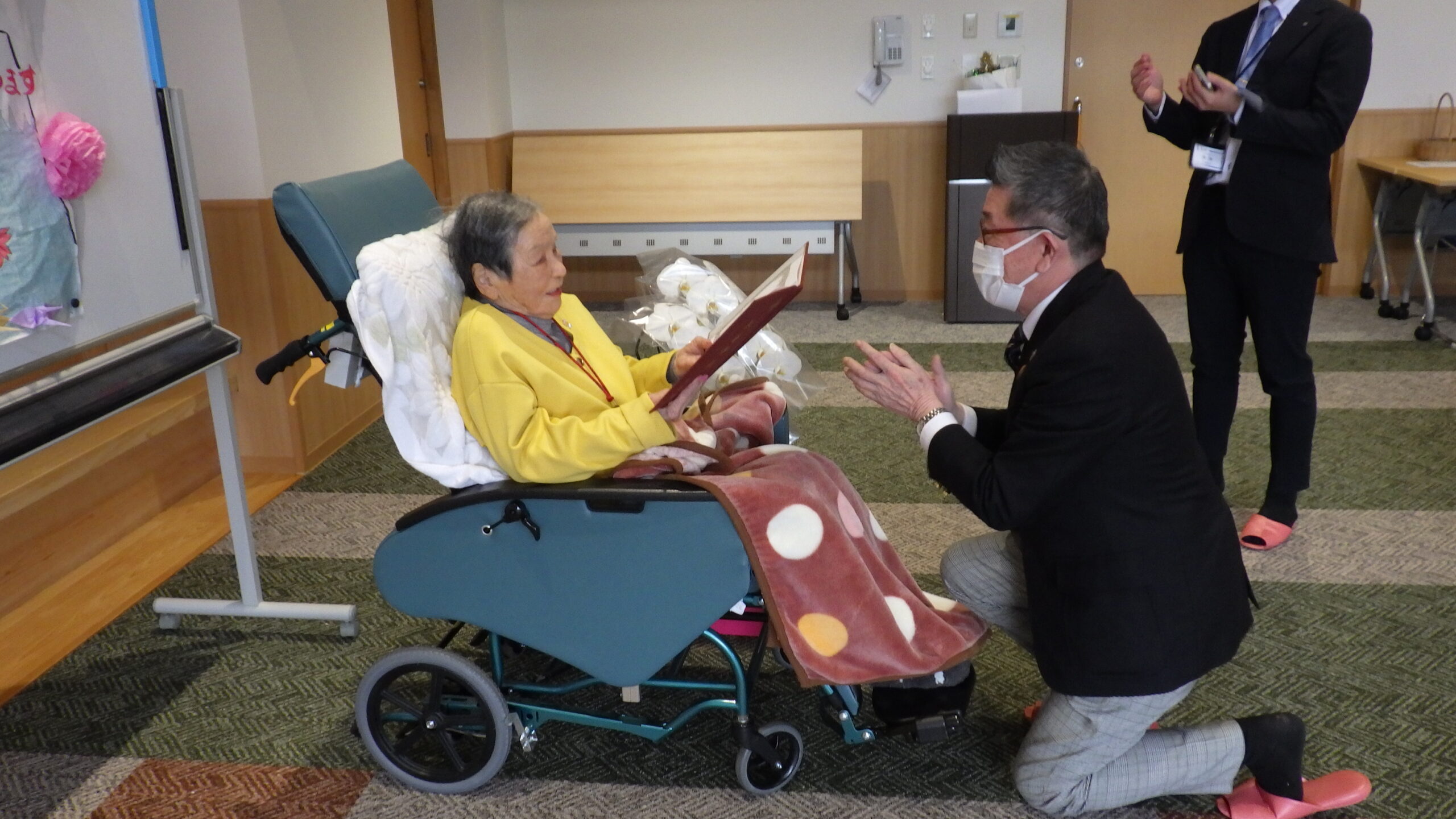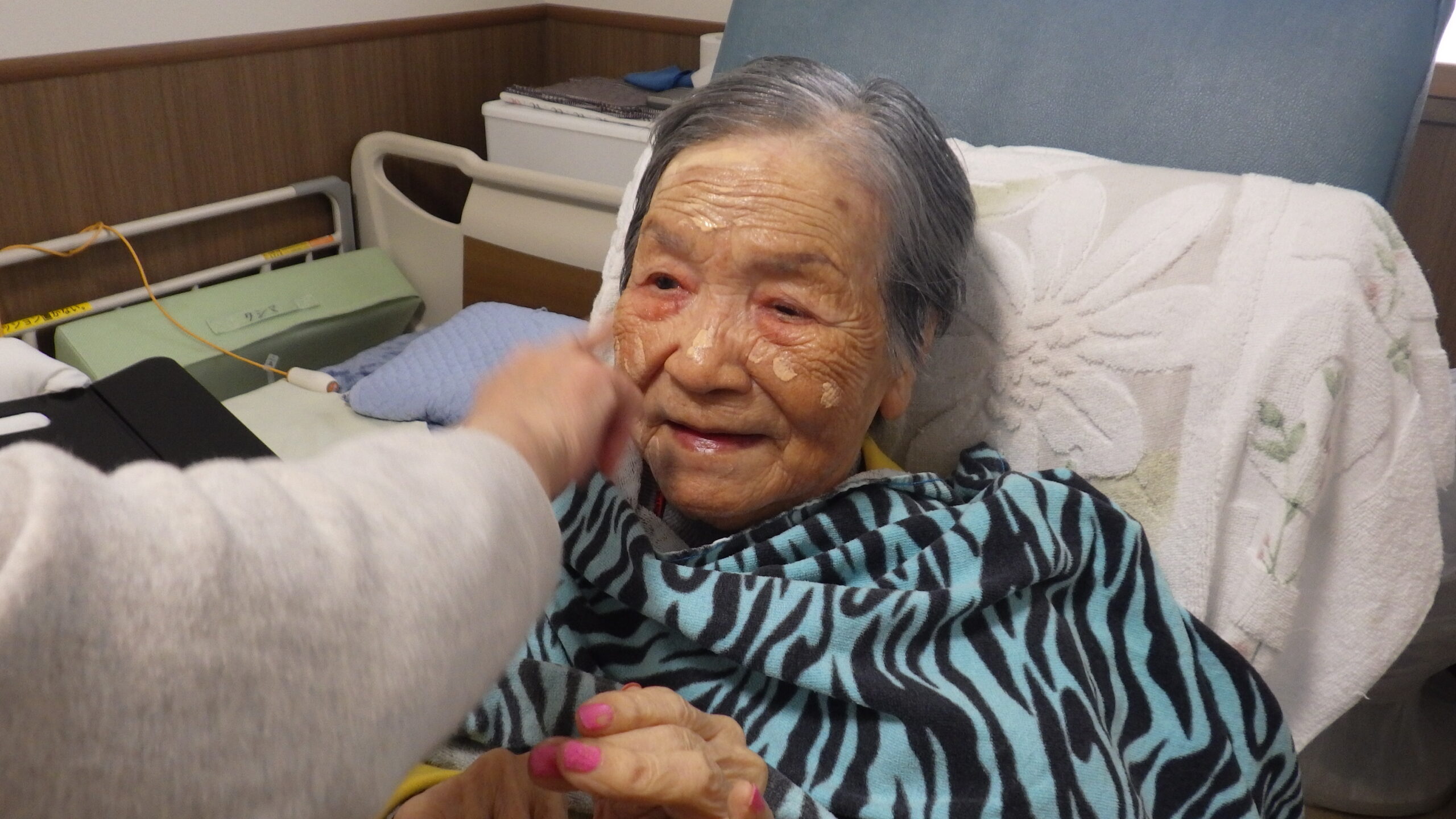 今日の優・悠・邑 和 2025.12.15 長寿のお祝い 今日は入所者様が105歳になられ 町長様からお祝いを受けられました。 町長様がお見えになられる前に まずお化粧をしてもらい 爪にピンクのネールをしてお気に入りのお洋服に着替え準備しました。本人も満足そうでした。下準備が出来待って見えました。 町長様からお祝いの言葉を頂き、記念写真を撮って頂き嬉しそうでした。 105歳 おめでとうございました。これからも元気で長生きして下さいね。//。