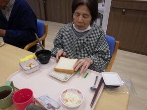 今朝は冷え込みましたね。なごみの朝食はパンの日でした。視覚に障害のある方もご自身でパンにジャムをつけ召し上がられます。