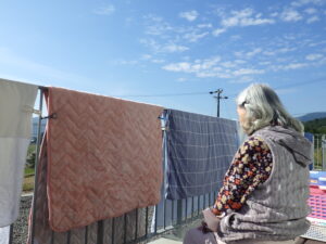 今日の優・悠・邑 和 2025.10.30 日向ぼっこ日和 朝はひんやりして肌寒かったですが、日中は晴れて暖かくいいお天気でしたね^^ いいお天気だとお掃除もはかどります。 こちらでは利用者さんが日向ぼっこしてみえました^^ 目の前には洗濯物ですが、その向こうは緑と青が広がっています!! 外でお話しすると心地よい風とぽかぽか陽気が気持ちいいです。 室内でも窓辺に移動してお日様を感じてみえます。 さあ、10月もあと2日、11月がもうすぐそこです。 おいしいうれしいお知らせが貼り出されていました。 みなさまお楽しみに^^