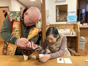 今年は職員が扮した獅子舞と一緒に、お屠蘇や抹茶の提供を行い、各フロアを周らせて頂きました。