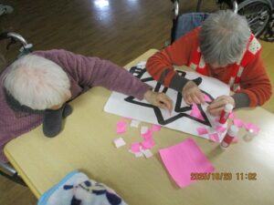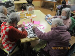 今日の優・悠・邑 2025.10.20 ちぎり絵 本日は曇りで、風がヒンヤリと冷たく感じる一日でした。 午前中にちぎり絵をしました。 来月の紅葉を楽しみに「もみじは赤色やね。」と話されながら、貼っておられました。 隣で見ていた方も近くに来られて「上手いな」「ここは、この色がええかもしれんな。」と話されていました。
