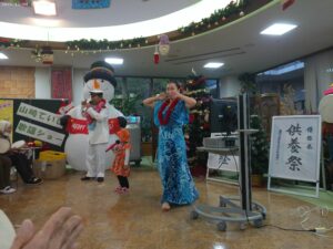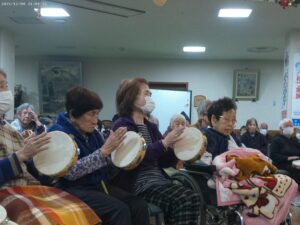 今日の優・悠・邑 2025.12.8 てるてる座 今日はてるてる座の方が来られました。 朝から「何時からやるの?」と楽しみにされていました。 昼食後、いい席をとろうとされている方もいるほど、たくさんの方が参加されました。 曲が始まると曲に合わせて手拍子をしたり、タンバリンや鈴で盛り上がっていました。 懐かしい曲を一緒に歌って、とても喜ばれていました。 23日には山崎ていじのクリスマス会があります。楽しみですね。