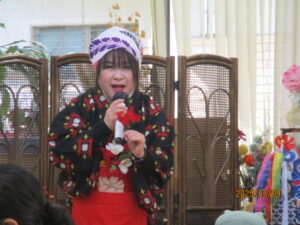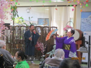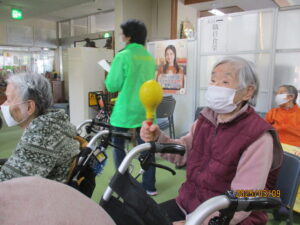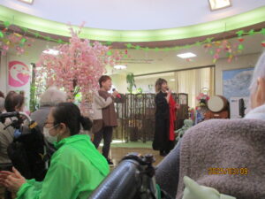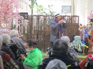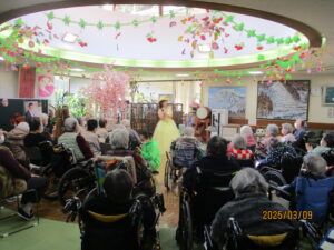 今日の優・悠・邑 2026.3.9 てるてる座 朝方はまだ肌寒い様子ですが、日中は少しずつ春らしい陽気になってまいりました。 本日午後からは皆様ご存じ「てるてる座」のボランティアがあり、多くの入居者様にご参加いただきました。 様々な衣装や歌や踊りを披露され、「毎月楽しみにしていますよ」「いつも元気をもらってるよ」と皆様、音楽に合わせ盛り上がってみえました。