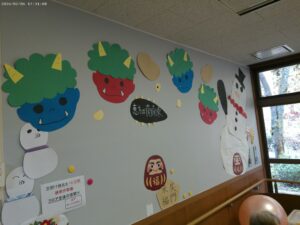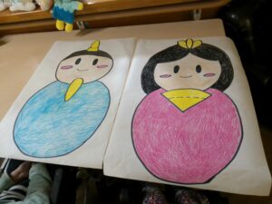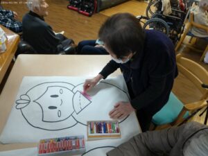 今日の優・悠・邑 2026.2.6 ひな祭りの飾り 節分が終わり、フロアの飾りも3月のひな祭りに向けて飾りを飾るための色塗りをしていただきました。 はじめは、「にいちゃん、どの色塗るの?」や「これでいい?」など言われて、真剣な表情でもくもくとお内裏様とお雛様に色を塗られていました。 そして、あっという間に完成。梅やぼんぼりを作り一緒に飾りつけていきたいと思います。