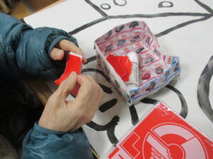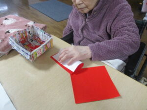 今日の優・悠・邑 2026.1.13 もうすぐ節分 まだ、雪がとけず寒い日が続いています。 2月3日 節分、 1月28日にもバイキングがあり、 テーマは「節分~今年の恵方は南南東!~」開催されます。 節分に向けて、午後から節分のはり絵の作成を手伝っていただきました。 「赤鬼、青鬼 どちらがいいかな?」 「赤鬼がいいね」と赤い折り紙をたくさんちぎり、一生懸命に鬼の絵に貼っていただきました。 完成したものは、またフロアの方に飾りたいと思います。完成が楽しみですね。