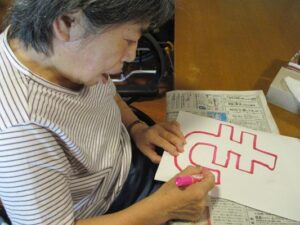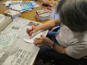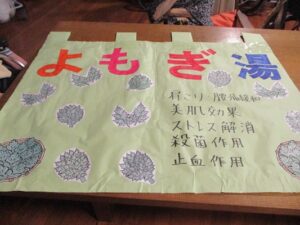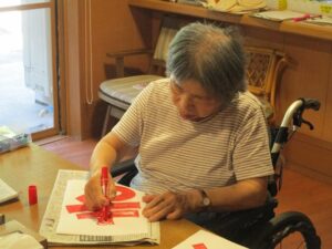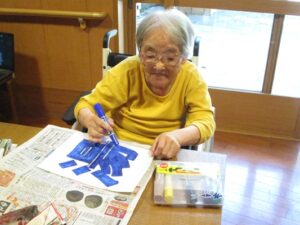 今日の優・悠・邑 2025.9.6 よもぎ湯のれん作り 今日は、9月15日、16日に行われるよもぎ湯ののれんの作成を、昨日に引き続き行いました。 よもぎの絵、「よもぎ湯」という文字のぬりえを、入居者様が一生懸命やってくださり、あっという間に完成しました。 とても上手で、きれいに出来上がりました。 敬老週間、イベントが盛りだくさんで、皆さん今からとても楽しみにされています。