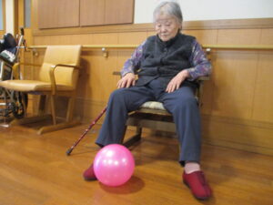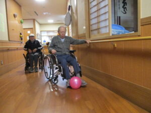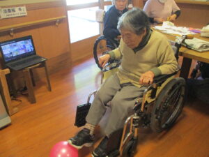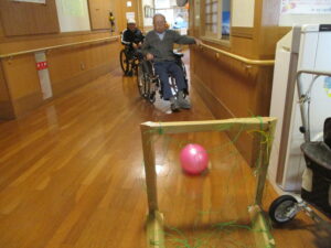 今日の優・悠・邑 2025.10.30 サッカー 本日も肌寒い日となりました。フロアの方では午後からサッカーのレクレーションを行いました。 始めは皆さま「これは難しいそうやな」「私が蹴るとボールがどっかに飛んでしまうから」と不安に話している方が多かったのですが、いざやってみるとボールをゴールに向かっていきよいよく蹴ってみえました。 一度行うと、皆さん楽しそうにボールを蹴られて盛り上がりました。