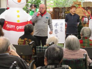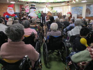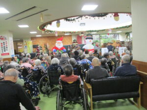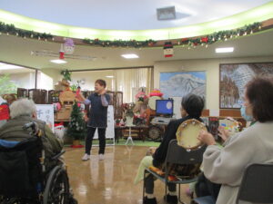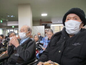 今日の優・悠・邑 2025.11.24 ジョイントコンサート 今日は曇って寒い日でしたが、衣類調整、暖かい服を選んでもらい暖かく元気に過ごしてもらいました。 午後からはジョイントコンサートに参加していただきました。 皆様、手拍子・タンバリンを歌にあわせてたたき、楽しんでいる様子でした。 最期に理事長と、施設長がで歌っていただき、皆様ニコッと笑っている様子もみられました。 高木さん・理事長・施設長ありがとうございました。 声をかけると「よかったわ」「きてよかった」など話していただけました。