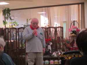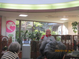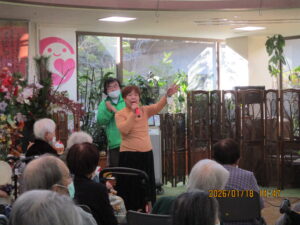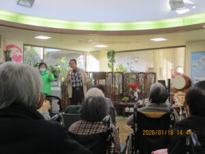 今日の優・悠・邑 2026.1.18 ジョイントコンサート 寒さはありますが、天気がよい一日でした。 午後からは、新年最初の、ジョイントコンサートがありました。 皆様ジョイントコンサートに参加され、タンバリンたたいたり、マラカス・鈴を鳴らしたりして 知ってる歌は、口ずさんだりと楽しい時間を過ごされました。 コンサート後はフロアに戻り、おやつを食べ、テレビをみたりして元気に過ごされました。
