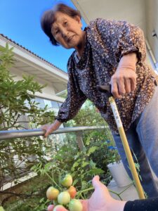 今日の優・悠・邑 2025.9.16 トマトの観察 今朝、利用者様と中庭でトマトに水やりをし、赤くなるのを楽しみにしながら笑顔で話しをしました。その後、椅子に座って日向ぼっこをし、鳥の声を聴きながら穏やかな時間を過ごしました。 今日も元気に過ごせたことに感謝です。 まだまだ、暑い日が続きますが、水分をたくさん飲んで元気に過ごしたいと思います。