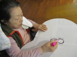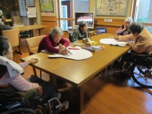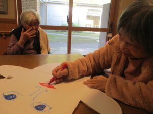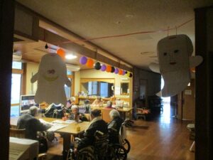 今日の優・悠・邑 2025.10.27 ハロウィンに向けて 最近、寒い日が多く、もう冬が近づいて来たなと、入居者様と話すようになりました。 そんな冬が来る前にあるイベントといえば、ハロウィンです。 明日のハロウィン行列に向けて、大きなおばけの顔を、入居者様に書いていただきました。 なかなか個性的に仕上がりました。 明日のハロウィン行事が楽しみです。