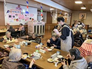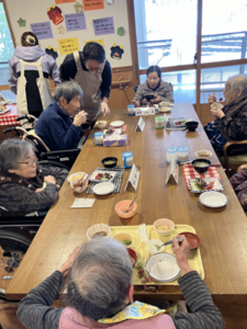 今日の優・悠・邑 2026.1.28 バイキング 今日はバイキングの日でした。テーマは「節分~恵方は南南東!~」です。 まだ寒い冬の季節ですが、利用者様はあたたかい料理を召し上がりながら、食事をとても楽しまれていました。 「太巻きがおいしい。」「また、食べたい。」と言われました。 笑顔が多く見られ、とてもうれしそうで元気な様子でした。