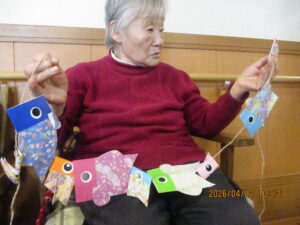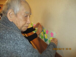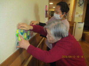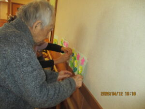 今日の優・悠・邑 2026.4.12 フロアの飾りつけ 今日は午前中入居者様に手伝っていただいて折り紙で作った鯉のぼりを吊るしたり、たんぽぽなどの春の花飾りをフロアに貼りました。 皆さんに「にぎやかになったね」「春らしくなったね」「きれいだね」ととても喜んでくださいました。 4/28にバイキングがあるので、メニューの掲示や話題提供も職員一同頑張っていきます。