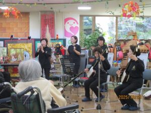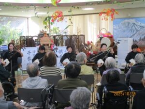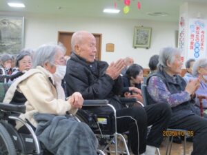 今日の優・悠・邑 2025.10.29 三味線ボランティア 今日は風が冷たいですが、日が差して気持ちがいい天気となりました。 午後から三味線ボランティアがありました。 みなさん手拍子したり、リズムに乗って頭をゆらしたり、三味線の方と一緒に歌を歌って、楽しい時間を過ごされました。