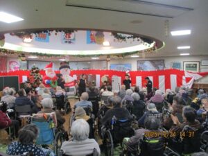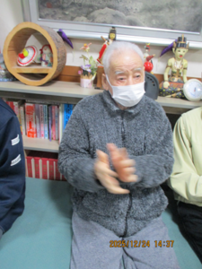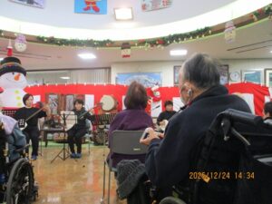 今日の優・悠・邑 2025.12.24 三味線 今日も雨が降ったり、やんだりして寒い日でした。 温かいごはんとお茶で、体を温めていただきました。 午後からは、みなさん三味線ボランティアに参加され楽しんでいただきました。 「どうでしたか?」と尋ねると、「よかったわ。」と喜ばれていました。 頭を動かしたり、歌ったり、笑って楽しんでいただきました。 今日一日、とても穏やかに過ごせました。