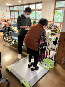 今日の優・悠・邑 2025.11.15 今日の出来事 今日の本館1階での入居者様や利用者様の過ごされ方は、様々でした。 その中でも、クリスマス会に向けて貼り絵を制作されたり、体重測定を行ったりしました。 貼り絵は1枚ずつ丁寧に、細かく貼り合わせてくださっています。本番の出来上がりが楽しみです。 体重測定は、次々と体重計に乗って頂き、「何キログラムやった?」と、気にされる利用者様が多く、 体のことを気にかけておられる方が多かったです。