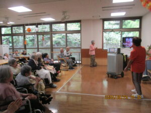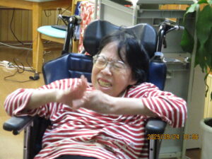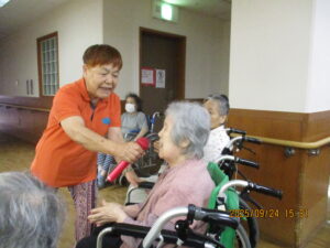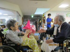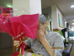 今日の優・悠・邑 2025.9.24 今日も楽しく 本日は涼しくて過ごしやすい一日でした。 皆さん自分のペースで過ごされていました。今日は、お誕生日のお祝いをフロアでしました。96歳の誕生日の方は、とてもうれしそうな表情をしてみえました。 午後から施設長の歌声を聴かれて楽しく過ごされました。