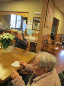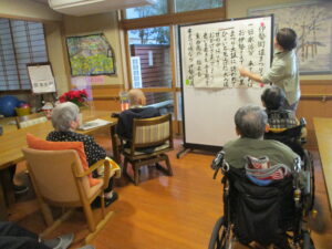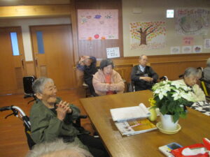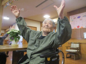 今日の優・悠・邑 2025.11.26 伊勢街道まつりの踊り 来月23日に行われる、クリスマス会に山崎ていじ様が来てくださり、歌謡ショーが開催されます。 ていじさんの曲で伊勢街道まつりがり、入居者様・職員で一緒に曲にあわせて踊りを行う予定です。 そこで、みんなで歌の踊りのふりつけの練習をしました。 練習前の準備体操、皆様よく手足を動かしておられました。 いざ踊りの練習を行うと「中々難しいわ」と笑いながら話されていました。時間がたつにつれて最初の方のふりつけができる方が少しずつ見られはじめました。これからも練習をして、クリスマス会に備えていこうと思います。