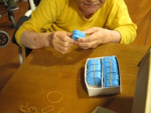 今日の優・悠・邑 2025.9.4 台風目前 今日は、台風15号が近づいている影響で風が強く、いつもよりすごしやすいなと感じました。 14日に秋祭りがあり、当日に使う引き換え券のチェックを、 入居者様と一緒に行いました。 以前に参加された方は「前に使ったことがある。」「やきそば食べたいわ。」と話してくださり、1000枚以上あるうちの7割ができました。