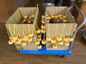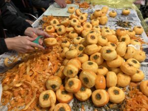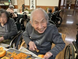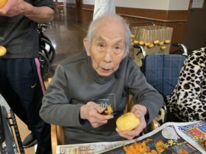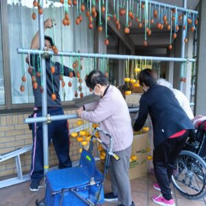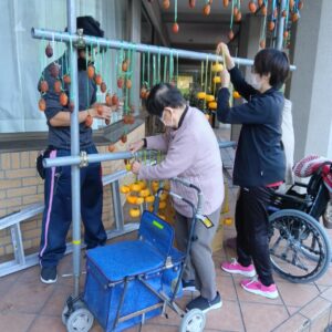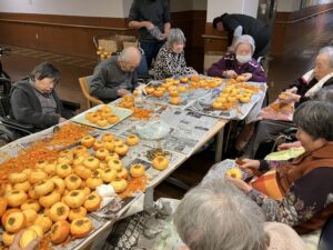 今日の優・悠・邑 2025.11.10 干し柿つくり 今日は寒い一日となりました。 先日、職員の方からいただいた柿を午後から、皆様と一緒に干し柿作りをしました。 「昔は夜なべをしてつくったわ」となつかしみながら、作っていただきました。 たくさんの方に協力してもらい、いっぱいできました。 出来上がりが楽しみです。 寒いなかでしたが、外につるすのも手伝っていただきました。