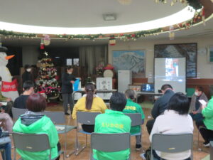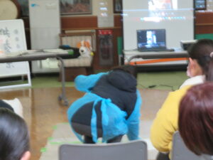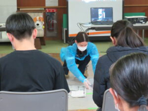 嘔吐物の処理の仕方。ガウンの着脱、吐物の処理の仕方など各フロアの代表の方にやっていただきました。
