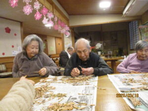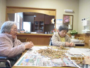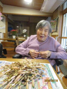 今日の優・悠・邑 2026.3.18 春はもうすぐですね。 今日は午前中に、テレビ体操・・身体を動かして、春の歌に合わせて体操したり 「なかなか難しいな?」と言われながら指の運動にもチャレンジしていただきました。 午後からは採ってきたつくしのはかまとりをしていただきました。つくしもたくさん見かけるようになってきましたね。 皆さん手際が良く、山盛りのつくしがあっという間にはかまがきれいに取れました。 バイキングで食べるのが楽しみですね。