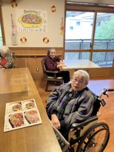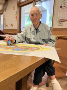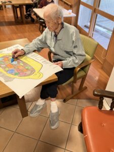 今日の優・悠・邑 2025.11.2 楽しみな行事 朝晩の寒暖差により、施設周辺の草木にも黄、赤、緑と紅葉が進み始めました。 今月17日(月)には心身ともに暖かくなっていただけるようにと利用者様も楽しみにしている芋煮会が行われます。 鍋の絵の色塗りをしながら、何の鍋料理が好きですかと話をしました。 また、16日は「すしざんまい」のバイキングが行われます。 たくさん食べて頂き、日々寒くなりますが、元気に過ごしていただけたらと思います。
