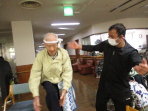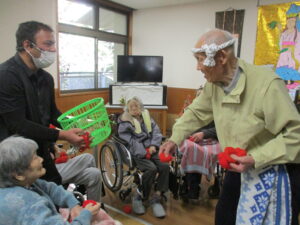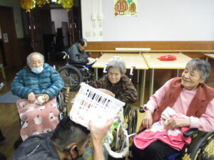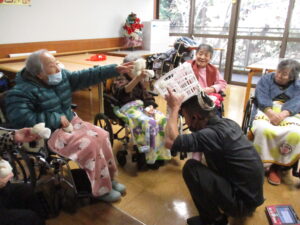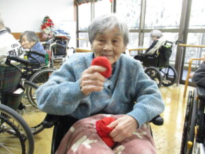 今日の優・悠・邑 2025.11.22 玉入れ 今日は晴れたり曇ったりと肌寒い一日でした。 体をあたためて頂こうと玉入れをしました。2チームに分かれて、どちらのチームが早くカゴに玉をいれられるかを競いました。 「権兵衛さんが種まいてホイホイ」とかけ声をかけながら玉をなげられたり 「さんはい!せーのっ」とかけ声をかけられたり楽しんでくださいました。 体もほかほかと、よい運動になりました。