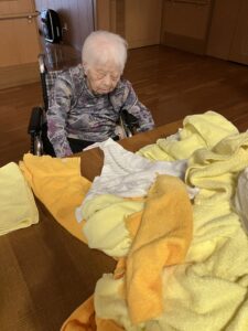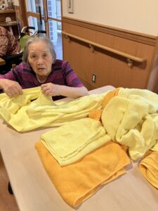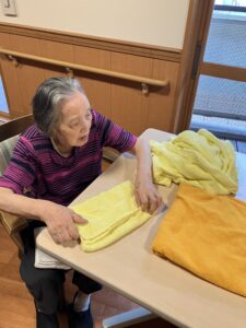 今日の優・悠・邑 2025.9.11 秋② 今日は雨があがり、少し暑さがやわらいだように感じます。 少し曇っており、日差しが強くないので、散歩にいきました。 「ここは自然がいっぱいでいい所やね」と笑顔で話され、写真をとってみせると部屋にかざるでほしいわと楽しい時間を過ごしました。 フロアの方に戻ってからは日課の洗濯物たたみを手伝っていただきました。 いつもありがとうございます。