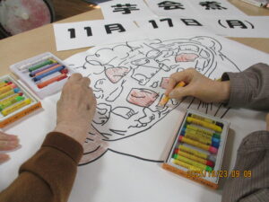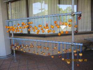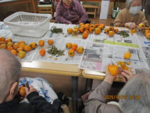 今日の優・悠・邑 2025.10.23 穏やかな1日 昨日は肌寒い1日でしたが、今日は穏やかな1日です。 フロアにて日なたぼっこやぬりえ、貼り絵をされたりのんびり過ごされました。 午後、干し柿づくりを快く、手伝ってくださいました。 秋祭りに続き、ハロウィンパーティー、芋煮会、焼きいもとまだまだイベントが続きます。