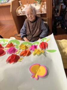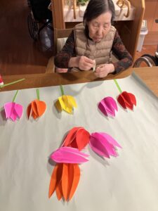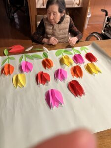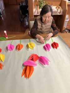 今日の優・悠・邑 2026.3.22 花作り 今日は、晴れたり、曇ったりしてまだまだ寒い日でした。 外は寒いですが、暖かいお茶など飲んでいただき、体をあたたかくして過ごしていただきました。 午後からはチューリップの花を作っていただき、楽しんでいただきました。 花をはってるとき「だんだんときれいになってきた」と楽しんでみえました。 できた後、みんなに見てもらったら 「あ・・きれい」「たくさんのチューリップの花やね」と話をされた方もお見えになり、壁に掲示すると、少し雰囲気がかわりました。今日は穏やかな一日を過ごしていただきました。