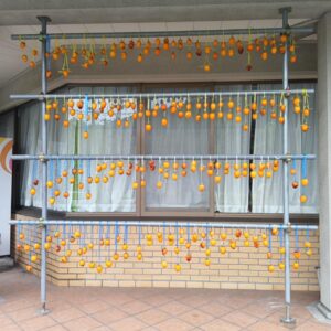 干し柿も、へたとり、皮むきしていただいて、玄関先につるされています。おいしい干し柿ができるといいですね。