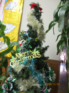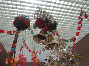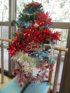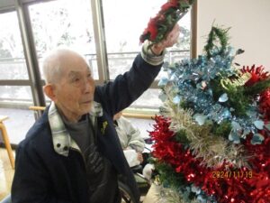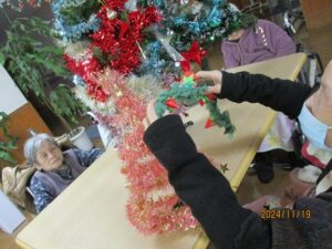 今日の優・悠・邑 2025.11.19 飾りつけ、続々と 窓の外では、紅葉に干し柿と、まさに秋一色の光景が広がっていますが、施設の中では、来月のクリスマスへ向けての飾りつけが、着々と繰り広げられています。 皆様、クリスマスツリーの飾りをご覧になりながら、「どこに取り付けたらいいか、よくわからんね。」干し柿の紐付けるのは、得意なんやけどね。」と、わいわいお話をされながら、飾りを取り付けてみえました。