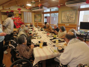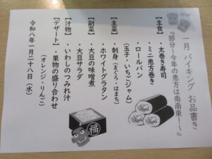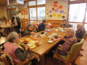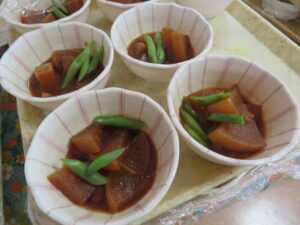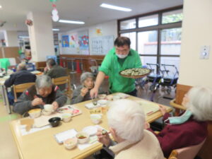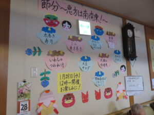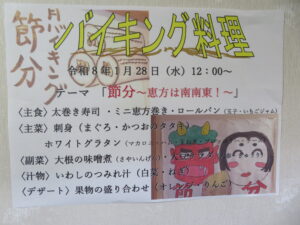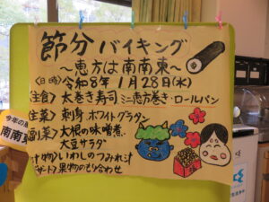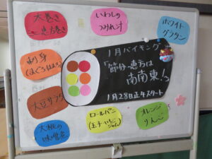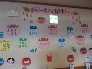 最近は節分と言えば太巻きのイメージが定着してきましたね。当施設では高齢者の方も食べやすい様に恵方巻きは細巻にして、提供させていただきました。