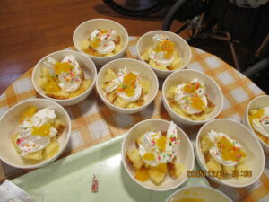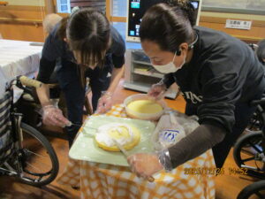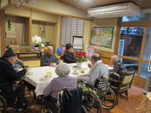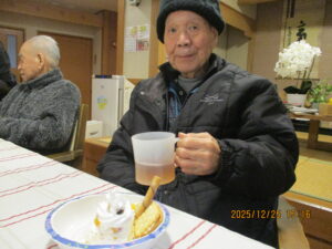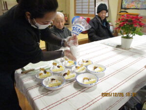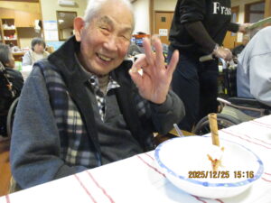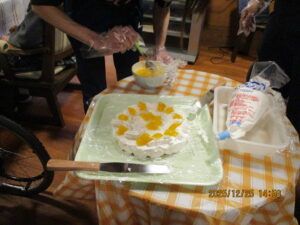 今日の優・悠・邑 2025.12.25 Xmasケーキ作り 今日はメリークリスマスでした。 あいにくの天気で寒かったですが、昼食には 午後から、各フロアでクリスマスケーキ作りをおこない、フロアの方でもみなさんに集まっていただいて、職員と一緒に、作っているときには、周りから声もかけてもらい、美味しいケーキが出来上がりました。 完成したケーキはおやつのときに食べていただいて、「美味しい」と話されながら召し上がってみえました。 その後はフロアで、テレビを観たり、カラオケを聞いたり、歌ったりと元気に過ごしてみえました。 楽しい一日となりました。