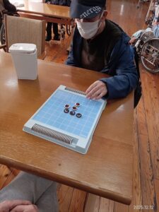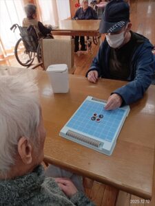 今日の優・悠・邑 和合 2025.12.12 「お参り」 今日はお参りの日でした。 理事長のお経に合わせて皆さん一緒になって唱えられていました。 「前は全然やったけど、半分くらいは詠めるようになったよ」と 教えて下さる入居者様もみえました。 午後からは脳トレと指先のリハビリもかねてオセロゲームをしました。 「置くとこあらへん」「あ、いっぱいとれたわ」「あかん、ゆびつかれた」 など楽しみながら行うことができました。